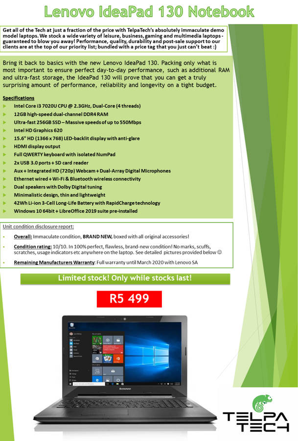One Year Hardware Failure Warranty with TelpaTech + full manufacturers remainder as per listing