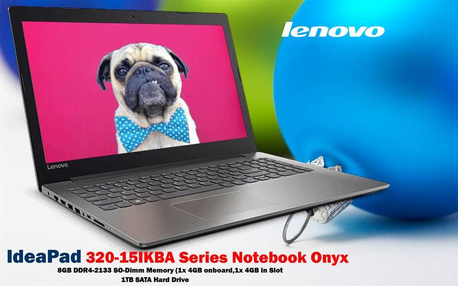Lenovo IdeaPad 320-15IKBA Series Notebook Onyx Black - Intel Core i5 Kaby Lake Dual Core i5-7200U 2.5Ghz with Turbo Boost up to 3.1Ghz 3MB L3 Cache Processor, 8GB DDR4-2133 SO-Dimm Memory (1x 4GB onboard,1x 4GB in Slot), 1 Memory slot, 1TB SATA Hard Drive, DVD Super Multi Writer optical drive, 15.6" WXGA HD (1366 x 768 resolution) LED Backlit Display, AMD Radeon 530 with 2GB dedicated graphics, 802.11ac Wireless Lan, 10/100 Mbit Ethernet LAN, Bluetooth, Webcam, 2 Cell battery, 2x USB 3.0 ports, 1 x USB 3.0 Type C port, HDMI output, 4 in 1 Card Reader, Microsoft Windows 10 Home 64 bit edition, Retail Box, 1 year warranty.