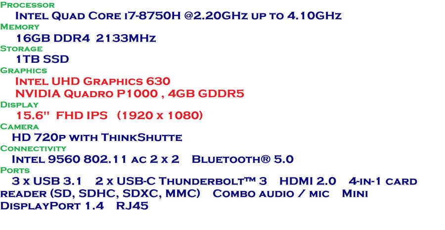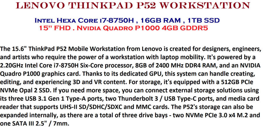 Lenovo Thinkpad P52 Mobile Workstation - Core I7-8750H  16GB RAM, 1TB SSD , Nvidia Quadro P1000 Lenovo Thinkpad P52 Mobile Workstation - Core I7-8750H  16GB RAM, 1TB SSD , Nvidia Quadro P1000 Lenovo Thinkpad P52 Mobile Workstation - Core I7-8750H  16GB RAM, 1TB SSD , Nvidia Quadro P1000 Lenovo Thinkpad P52 Mobile Workstation - Core I7-8750H  16GB RAM, 1TB SSD , Nvidia Quadro P1000