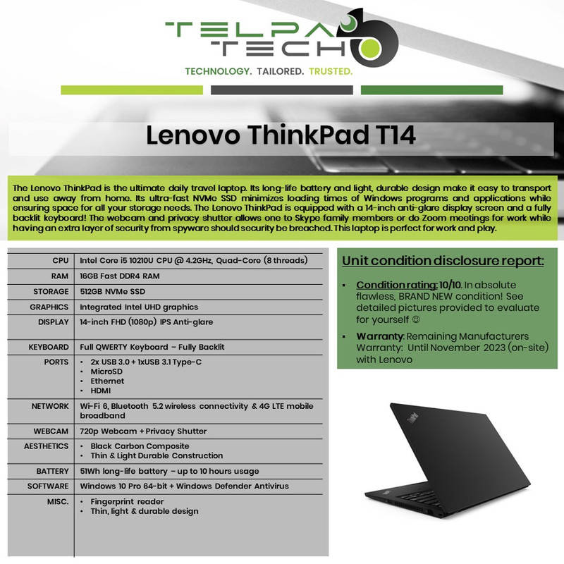 Lenovo ThinkPad T14 Business UltraBook - 10th Gen Core i5, 16GB DDR4 RAM, 512GB NVMe, 14` FHD, LTE