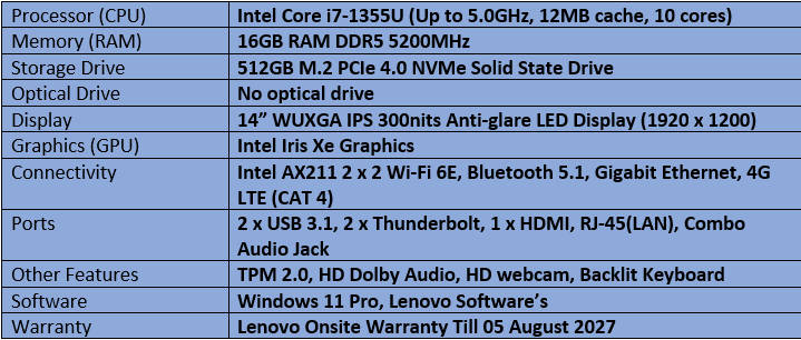 16GB DDR5 RAM(5200 MHz),512GB SSD,14" WUXGA IPS 300nits Display(1920X1200), 4G LTE, Windows 11 Pro