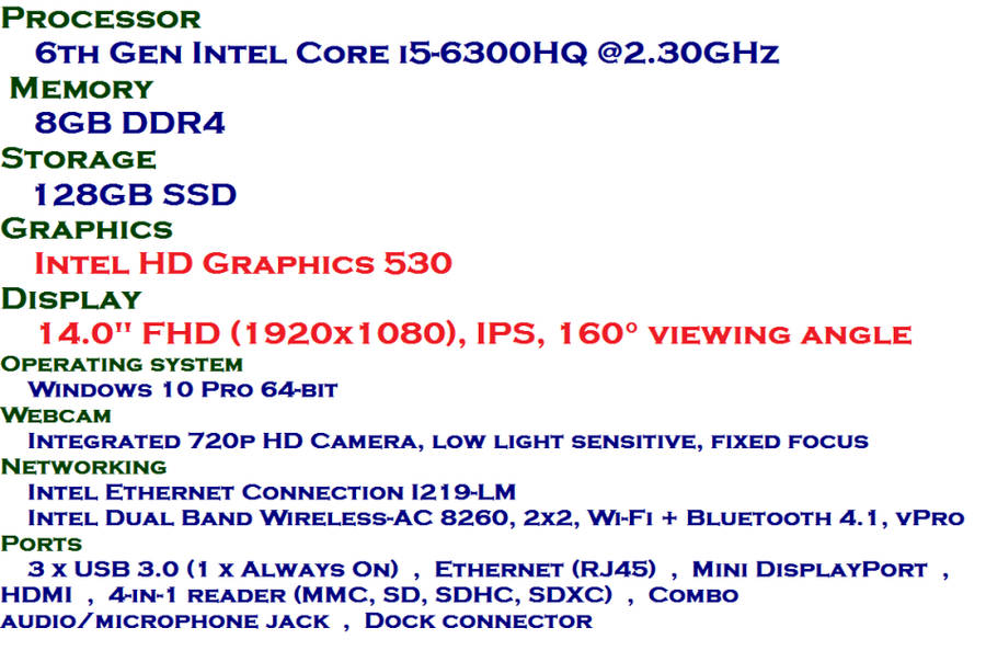 INTEL CORE I5-6300HQ @2.30GHz, 8GB RAM ,128GB SSD , INTEL HD GRAPHICS 530
