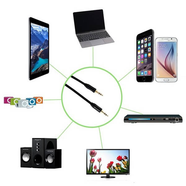 Feature: 1. Convenient Compatibility: support any device that equipped with standard 3.5mm audio jack or AUX-in port, connects your iPhone, iPod, Smartphone, tablet and MP3 player to a car stereo, portable speaker or other 3.5mm stereo audio output. 2. High-quality polished metal molding and corrosion-resistant gold-plated plugs with oxygen-free copper conductors that minimize the signal loss and offer the strongest connection for premium audio playback and functionality. 3. Aluminum lining with double-shielded to provide a clear sound by reducing electromagnetic interference and radio frequency (EM/RF) interference. 4. Innovative Beveled Step-down Design for a secure connection and allows plugs to be completely seated even with bulky protective case. 5. Durability: this audio cable wraps with a braided nylon cloth fabric for added durability and longevity; it also prevents the cable from tangling and tearing when bent.