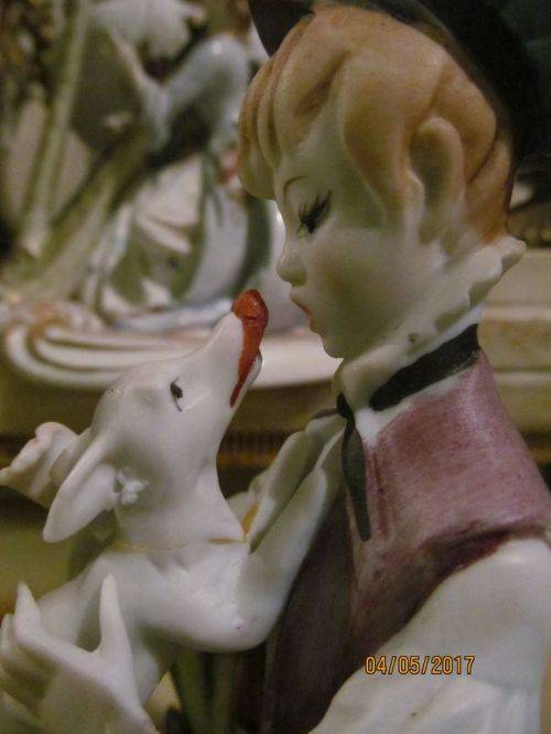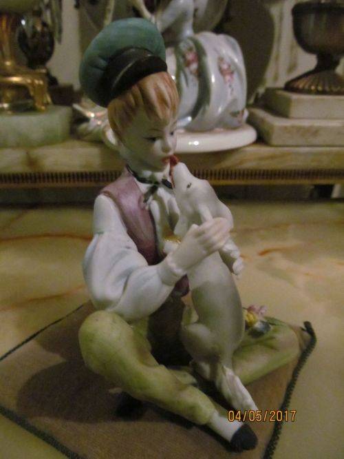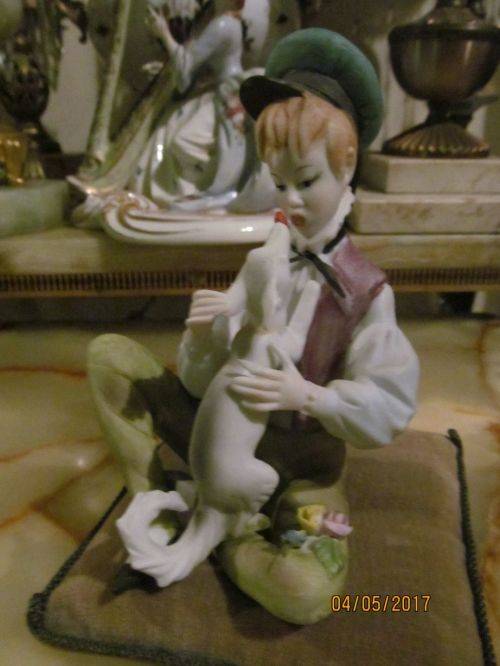 A RARE LENWILE ARDALT HAND PAINTED BISQUE FIGURINE OF A YOUNG BOY CLOTHED IN PERIOD DRESS AND SEATED ON A REAL OLIVE GREEN CUSHION. THE ITEM WAS MANUFACTURED IN JAPAN IN THE 50's - 60's AND THE CUSHION IS THE ORIGINAL CUSHION. A SMALL DOG CLAMBERS UP AGAINST THE FRONT OF THE BOY IN A GESTURE OF PURE CANINE AFFECTION. A CAPODIMONTE STYLE PAIR OF ROSES IN PERFECT CONDITION ARE PLACED ON THE BOYS LEFT LEG