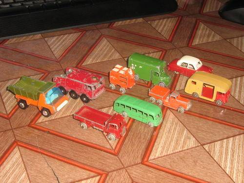 Tipper on far left is playart circa 1970's. Please note the missing gate on the horse box, missing lettering on the airport fire truck and broken horses off the cart.