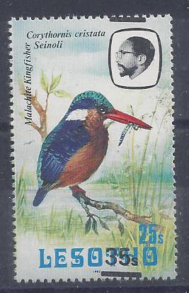 LESOTHO 1986/88 Surcharge 35s on 25s Kingfisher with overprint shifted down and left, virtually off stamp, very fine unmounted mint. SG 720 var.