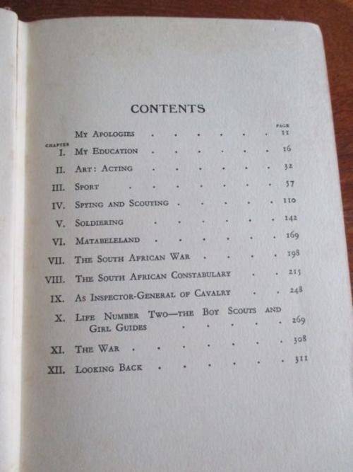 Contents: My Apologies; My Education; Art and Acting; Sport; Spying and Scouting; Soldiering; Matabeleland; The South African War; The South African Constabulary; As Inspector-General of Cavalry; Life Number Two; The Boy Scouts and Girl Guides; The War; Looking Back; With 8 illustrations and 115 Drawings by the Author. The following is Powell's explanation of why he wrote this book: 'I didn't want to write this yarn about myself; an autobiography is bound to be an egotistical repetition of 'I" but several different people have asked me to write some of my experiences because they might be helpful to young fellows in aiming their lives. So it is mainly for these-and I include girls as well as men under the term 'fellows" -that I write, seeing that I have passed through the 'varsity' of the world above-mentioned. I don't propose to make it a formal biography beginning with my babyhood and going progressively through the years of my life. It will rather be a sort of hotch-potch or plumb-pudding, though I am afraid the plumbs will be few and you will have to pick them out for yourself." Although Powell's introduction is exceedingly modest, this book will take you on a tour of the adventures, viewpoints, and accomplishments of the remarkable man who founded scouting.