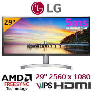 LG 29WK600-W.BFB Series 29 Inch Ultra Wide LED Dynamic Action Sync FreeSync Monitor - IPS panel, Viewing Angle (CR10) 178/178, Full HD 2560 x 1080 x1024 Resolution, Aspect Ratio 21:9, Response Time 5ms (GTG High), 250 cd/m2 Brightness, Anti-glare, Anti-Glare 3H Coating, Native Contrast Ratio (Original) 1000:1, 2x HDMI, 1 x Display Port, Headphone Out Jack, 2 x 5w Max Audio Speakers, VESA Wall Mountable - Black, Retail Box , 3 year warranty.