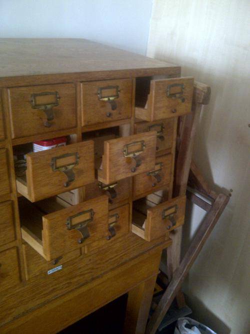 Library card holder - solid oak, beautifully made. drawers in perfect working condition. please note, though, top corner has some water damage, nothing that can't be fixed up and only on top right hand corner - that's the reason I'm selling it for so little, so for someone who wants it it's going at a steal - even if someone were to just reuse the drawer handles - it would cost more than the whole unit!