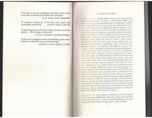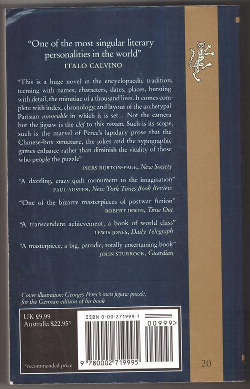 This marvellous book is one of the most ingenious works of modern fiction, an entire microcosm brought to life in a Paris apartment block. Serge Valene wants to create an elaborate painting of the building he has made his home for the last sixty years. As he plans his picture, he contemplates the lives of all the people he has ever known there. Chapter by chapter, the narrative moves around the building revealing a marvellously diverse cast of characters in a series of ever more unlikely tales, which range from an avenging murderer to an eccentric English millionaire who has devised the ultimate pastime...