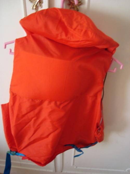 Brightly coloured orange life jacket with light and whistle, marked VS Velerias. Giorgio Italy and a label inside with the same marking and Portofino with writing in Italian I think conforming to the specifications of that country,will fit an adult.