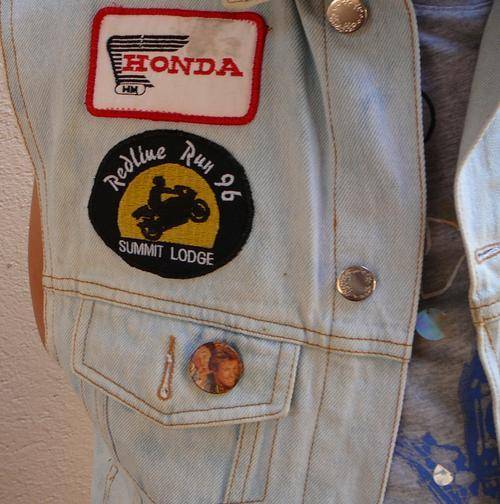 This Sleeveless Denim Jacket by Wrangler is covered in patches and badges, it is Size 14 (UK) the waist measurement is 870 mm (34 inches) with the button closed.