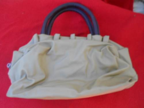 Light brown handbag with dark brown handles..  Gill design. Zip on outside pocket.  Inside : pocket for cell phone and another zipped pocket.