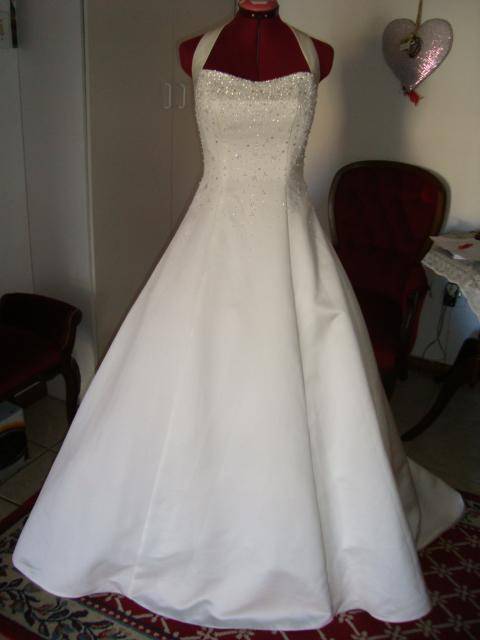 THIS IS A LIGHT CREAM/IVORY DUCHESS SATIN HALTER NECK WEDDING DRESS IN THE A-LINE STYLE.