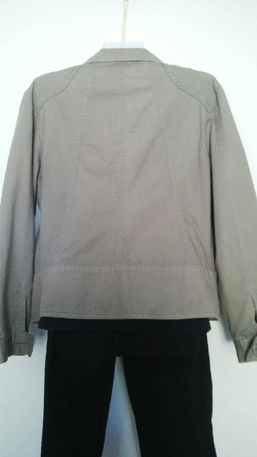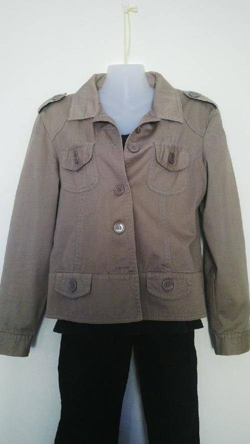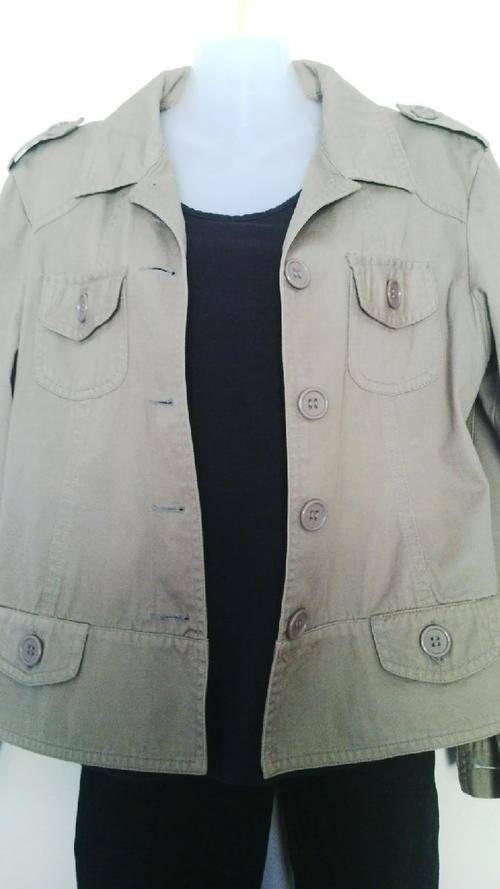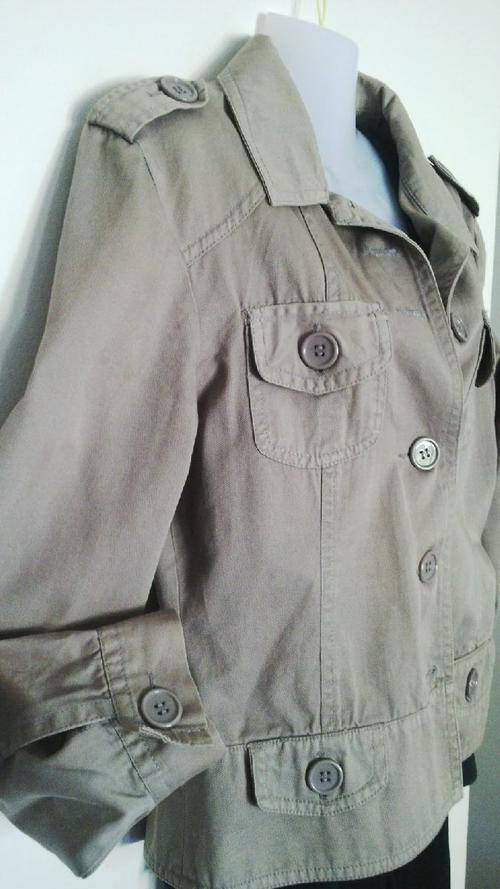 Light green military style jacket with nice pocket detail, (has 2 marks on back and a button missing from cuff) otherwise in in good condition