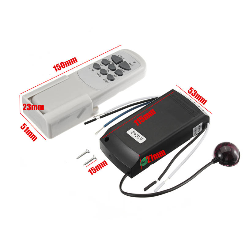 Specifications: Power: 220/240V 50Hz 2W Pating: 1.25A for fan and 300W for light kit Remote control distance: 12 meters Battery model NO: R6 size AA Um3 1.5V Battery quntity: 2 (not included) Receiver size: 115*53*27mm Remote control size: 150*51*23mm