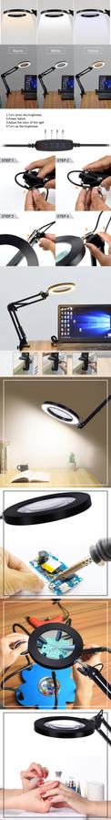 | Features: Desktop LED Light and Magnifier 2-in-1: magnifier with LED light designed, which providing enough light at night for you without turning on the ceiling lights. Brightness Adjustable: LED light with 10 levels of luminance adjustable, press the adjusting button to change its brightness as you need. Comfortable LED Light: LED light has three modes to switch from: warm, white, and yellow, easy to switch by the push button, light source is no flicker, eye-protection. Adjustable Swivel Arm: the lamp is 360° rotatable and the joint of the arm can be flexibly adjust to the position you need. Clamp-on Base: large C-clamp enable you to clip the lamp magnifier to any table, desk, bench, worktable or counter up to 2-inch(55mm) thick, which not only free your hands but also save desktop space. USB-powered: LED light can be powered by computer, and other electric appliance with USB ports. Wide Applications: the lamp magnifier with 5X magnifications, which helps a lot in seeing the tiny components, reading books, soldering, model building, sewing, and more. Suitable for school, study, office, library, laboratory, etc. Specification: Material: aluminum alloy, fine iron Light source: LED chip Switching method: USB push button switch Power: 14w Bracket size: 740mm Base size: 160mm (thickened aluminum with inner ring) Aluminum work clamp size: 81mm ' Magnifying glass size: 130mm Package includes: 1 * Lamp Magnifier 1 * C Clamp Details pictures: ![]() ![]() ![]() ![]() ![]() ![]() ![]() ![]() ![]() |