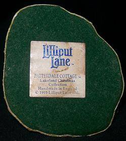 This item is 7cm high and has a missing chimney. Label reads Lilliput Lane Patterdale Cottage, Lakeland Christmas collection, Handmade in England C 1995,Lilliput Lane Ltd.