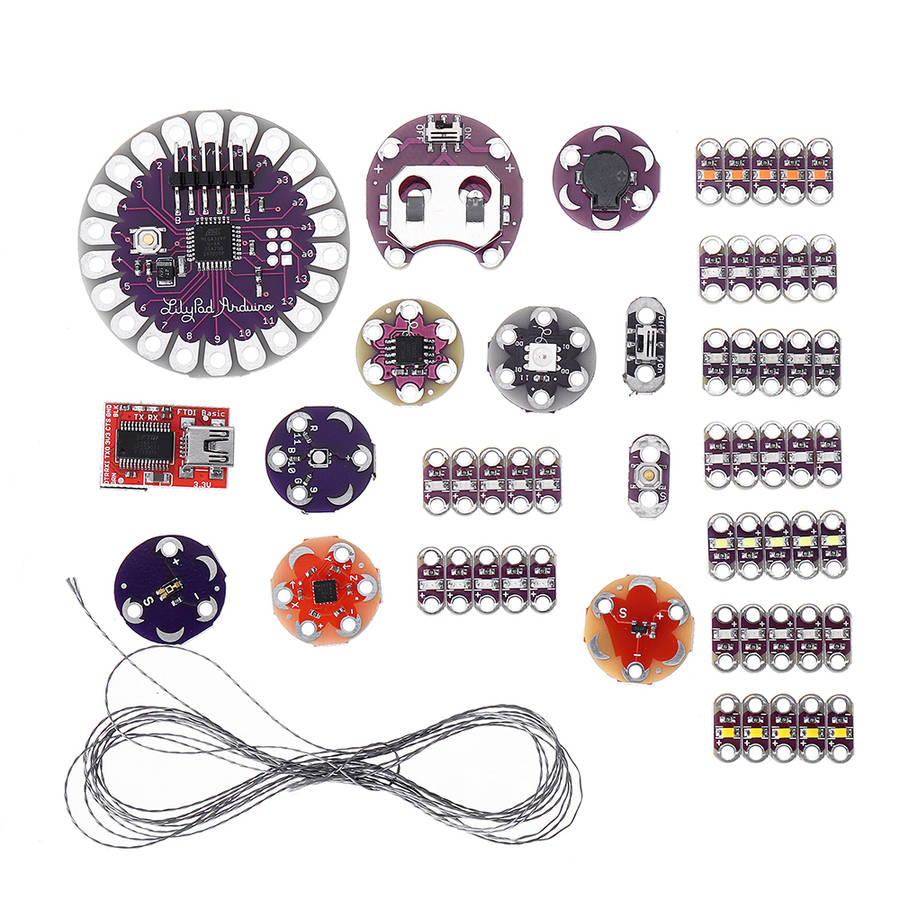 Package Included: 5 x 5 x LilyPad LED Arduino red 5 x LilyPad LED Arduino pink 5 x LilyPad LED Arduino yellow 5 x LilyPad LED Arduino blue 5 x LilyPad LED Arduino Emerald 5 x LilyPad LED Arduino yellow green 5 x LilyPad LED Arduino orange 5 x 1 x LilyPad Pixel Board WS2812 purple disc 1 x 1 x 1 x 1 x 1 x LilyPad supporting conductive sewing thread 2 meters 1 x LilyPad Buzzer module 1 x 1 x LilyPad Button Board button 1 x LilyPad ADXL335 three-axis gravity acceleration sensor 1 x LilyPad Slide Switch toggle switch 1 x 1 x