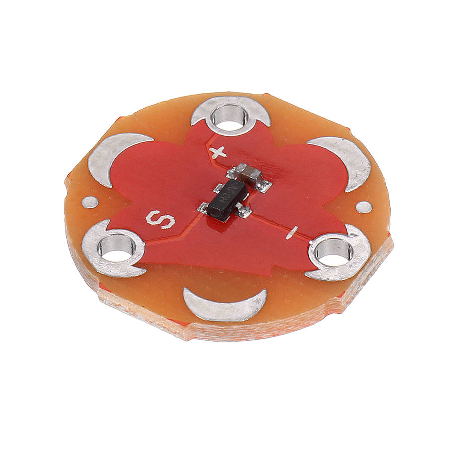 Description: Detecting temperature changes has never been easier. The MCP9700 is a small thermistor type temperature sensor. This sensor will output 0.5V at 0 degrees C, 0.75V at 25 C, and 10mV per degree C. Doing an analog to digital conversion on the signal line will allow you to establish the local ambient temperature. Detect physical touch based on body heat and ambient conditions with this small sensor. LilyPad is a wearable e-textile technology developed by Leah Buechley and cooperatively designed by Leah and SparkFun. Each LilyPad was creatively designed to have large connecting pads to allow them to be sewn into clothing. Various input, output, power, and sensor boards are available. Theyare even washable! Package Included: 1 x LilyPad MCP9700 Temperature Sensor Module