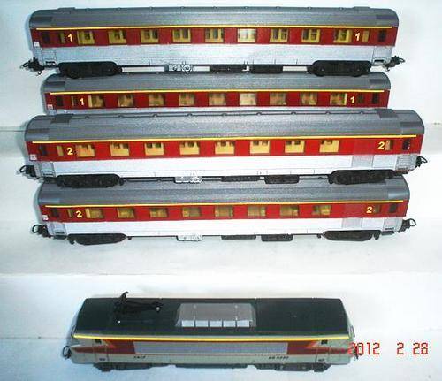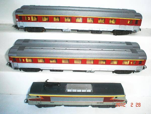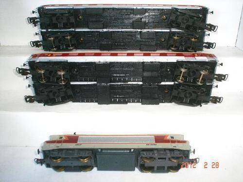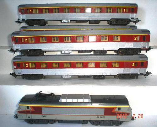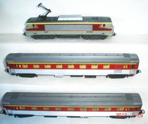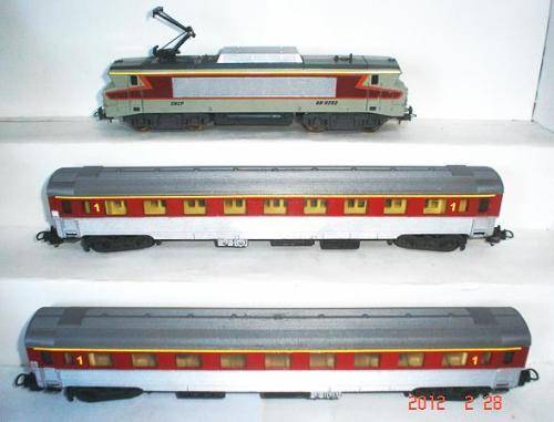 On auction is a SNCF train set in a very good condition. Total length of the complete train is 1.32m long. The loco is a smooth runner in both directions and it seems to be in a very good mechanical condition. The passenger coaches have been professionally re-sprayed and are fitted with reflective yellow stripes and numbers. All items are fitted with Lima couplers, all replacement buffer stops intact. This is a very nice set at a bargain price and I am sure it will be an attractive addition to your collection. Please see photos for detail for it is part of the description. Contact me by e-mail for enquiries.