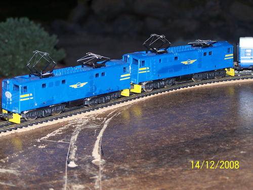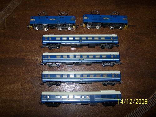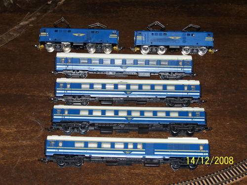 Replica of the Blue Train (Lima Product - 1977) Very good condition. One engine, one dummy engine and 4 passenger wagons. Engine serviced one month ago. This is a dream train and a must to have in your collection if model trains are your hobby and it fits your layout theme. Good luck with the auction.