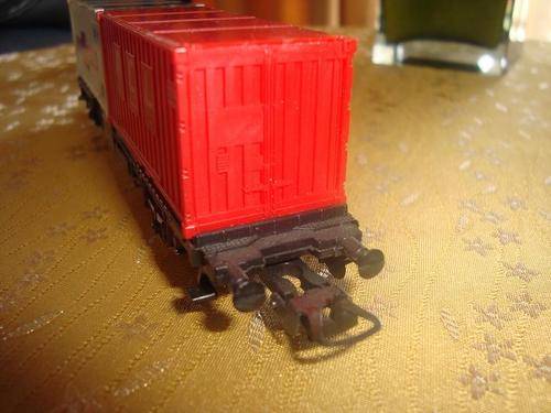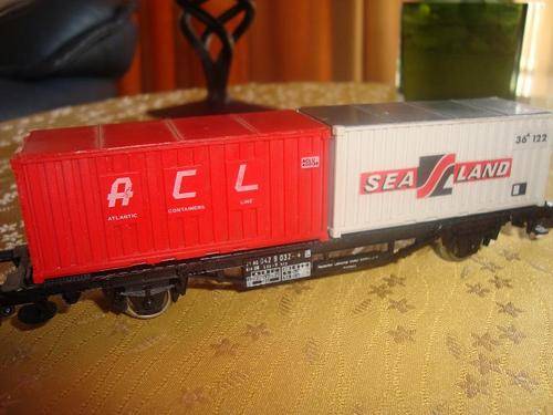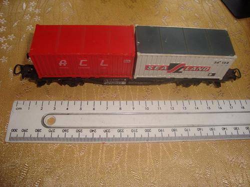 This is a container wagon with two containers by LIMA. This wagon is HO gauge. This wagon is in a very good condition and has all it's couplings and buffers. All writing is clear and undamaged. The wagon has metal wheels.