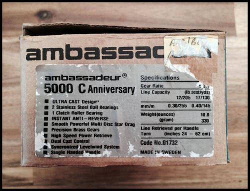 This Limited Edition Abu Garcia Ambassador 5000C Anniversary Baitcasting Reel was given to me as a gift a few years ago and since then the reel has never been used. The only damage related to the reel are water stains on the reel's box and Limited Edition Certificate due to a burst geyser.