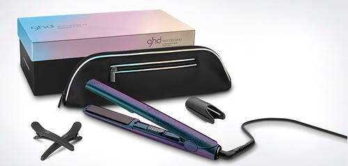 Step into a wintery world full of magic with the limited edition ghd wonderland styler gift set. This enchanting styler, which shares all the features of the ghd V gold classic styler, shines in a spectrum of cool blue, lilac and teal shades and, with its iridescent finish, changes colour in different lights and from different angles. Sparkling black plates glide effortlessly through your hair to make straightening on all hair types and lengths quick and easy. And if it’s curls and waves you want to create, the plates’ contoured edges are designed to give you perfect results every time. Each styler is packed with handy features such as an extra long cord to allow for flexible styling, automatic sleep mode after 30 minutes without use and universal voltage, so you can use your styler anywhere in the world. The gift set is completed with two sectioning clips and a co-ordinating styler bag that unzips to become a heat-resistant mat – perfect for using at home or when travelling.