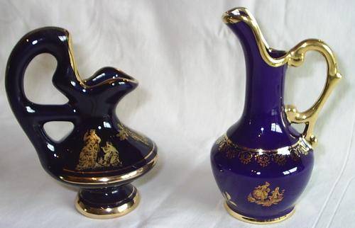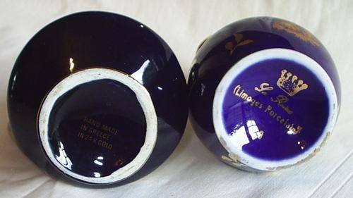 Dainty gilded Limoges porcelain bud vase in cobalt blue and a hand made porcelain black Greek bud vase with 24kt gilding.