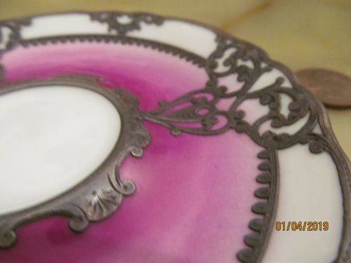 THIS EXTREMELY RARE DEMITASSE DUO IS CRAFTED ENTIRELY FROM DELICATE BONE CHINA AND DECORATED IN A BRASS ROCOCO PATTERNED OVERLAY. THE ITEMS ARE ALSO HAND PAINTED IN A MAGNIFICENT PURPLE TONE WHICH DARKENS UPON THE SAUCER FROM CRISP WHITE TO LAVENDER AROUND THE VERGE AND THEN GENTLY MERGES FROM VIOLET TO PLUM. AN IDENTICAL DESIGN IS ENCAPSULATED UPON THE CUP