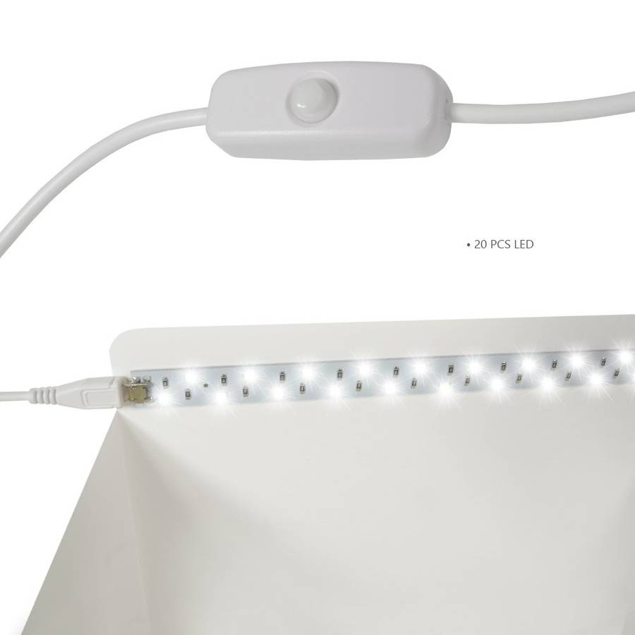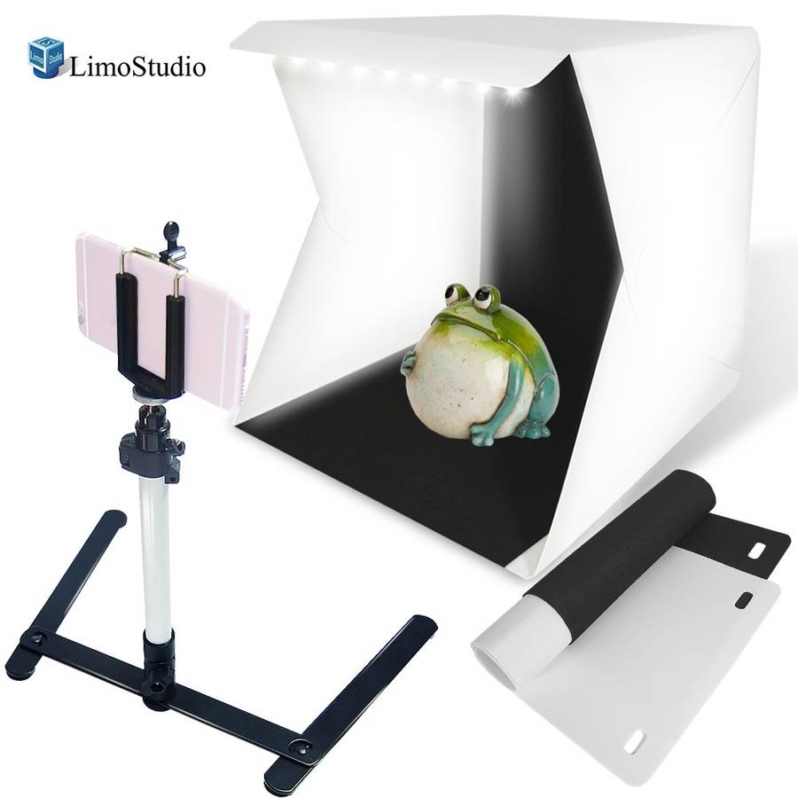Portable LED Light Box Shooting Tent¿¿¿ 24 x 24 x 22cm Dimension¿¿¿ Easy to Set-upwith Built-in Magnet¿¿¿ LED Light Beads Powered by USB Cable¿¿¿ 2 Backdrops:Black, White¿¿¿ Suitable for Commercial Product Shooting¿¿¿ White PP FilmMaterial¿¿¿ 20pcs LED Beads, Cool Color, 6000¿¿¿6500KTable Top Mini Camera Stand¿¿¿Max Height 17 Inch¿¿¿ Angle Adjustable¿¿¿ 1/4 Inch Screw Thread TipCell Phone ClipHolder¿¿¿ Compatible with Any Cell Phone¿¿¿ Spring Clip Enables Easy Install¿¿¿ 1/4inch Screw Hole¿¿¿ Firm and Secure
