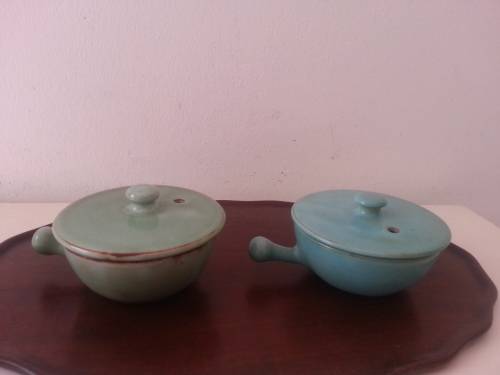 Offered for sale is a small Linn Ware lidded serving dish in an attractive turquoise glaze . The bowl has a shaped applied handle and is signed on the base with the LW initials hand painted . The lid is round with a vent hole and short rounded finial. The piece is in good condition however there is a small chip on the underside of the lid. It is one of two green bowls listed separately. The second item is in a pale grass green glaze with traces of russet brown. Dimensions are : width including handle 14cm ; height 6cm diameter of lid 11cm ; diameter of base 5cm