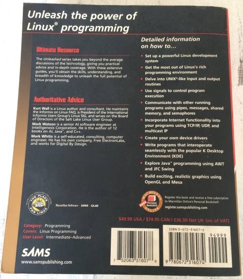Linux Programming Unleashed is a complete and comprehensive reference for intermediate to advanced Linux developers that covers every possible use of Linux. Topics include: Core Linux Programming; Interprocess Communication; Device Drivers; Development Tools (make, Emacs, diff and patch, etc.) ; Programming the User Interface; programming (including Motif, Athena, GTK, QT, and more) ; Scripting; Security; System Programming Using Libraries; Package Management; and Licensing. Linux Programming Unleashed contains hundreds of professional programming techniques and code for many real world applications.