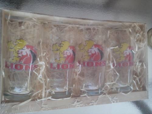 LIONS RUGBY 4 WILLY GLASSES GIFT PACK in a wooden crate