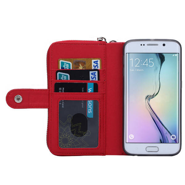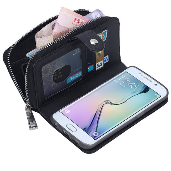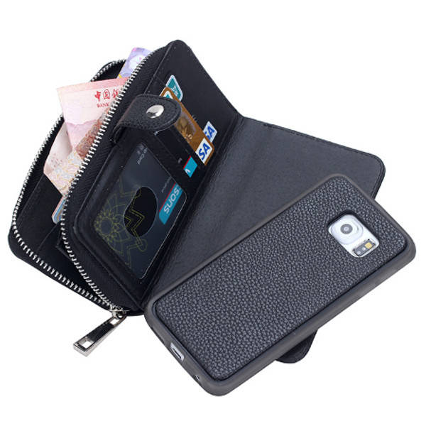 Litchi Grain Leather Wallet Case Removable Zipper Card-slot Case for Samsung Galaxy S6 Edge Plus