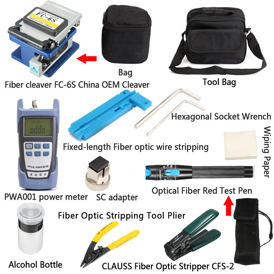 1 x PWA001 power meter 1 x 1Mw Visual Fault Locator (With 1pc Bag) 1 x SC adapter 1 x Fiber cleaver FC-6S China OEM Cleaver(With 1pc Bag) 1 x CLAUSS Fiber Optic Stripper CFS-2 1 x Fiber Optic Stripping Tool Plier 1 x Fixed-length Fiber optic wire stripping 1 x250ML Hard Alcohol Bottle Container 1 x 250x190x170mm Tool Bag 1 x Wiping Paper 2 x Replaceable Red Test Pen core 2 x Hwxagonal Socket Wrench