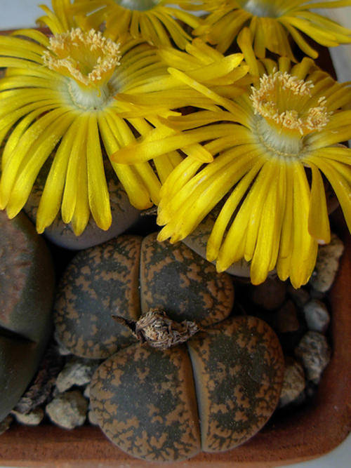 Lithops are probably the most well known and popular member of the large succulent plant family, the Mesembryanthemaceae. They are commonly called living stones or stone plants because they so closely resemble the surrounding pebbles of their natural habitat, either in coloration or shape or both. This camouflage allows them to escape detection and is a very effective strategy for escaping predation. Their resemblance to stones has also given the genus its scientific name: from the Greek lithos meaning stone and opsis meaning appearance or resemblance. They are known in Afrikaans as beeskloutjies, because the plants also look like miniature hoofprints of cattle. A lithops plant consists of a two-lobed, upside down cone-shaped, body that is in fact a fused and thickened pair of opposite leaves. The stem is very short and not visible. In their native habitat the leaf pair grows sunken in the gravely soil with only the upper portion visible. This part is called the window, and it allows light into the inner portion of the leaf where it is diffused before reaching the green chlorophyll, which is scattered along the inner leaf margins, where the process of photosynthesis is carried out. The leaf pair is replaced by a new one every year and the leaf sap is recycled from the older to the younger leaf pair, thus maximising on moisture and nutrient conservation. Lithops plants will produce more than one leaf pair so that a single body gradually becomes a smallish cluster.