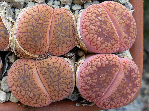 Lithops are probably the most well known and popular member of the large succulent plant family, the Mesembryanthemaceae. They are commonly called living stones or stone plants because they so closely resemble the surrounding pebbles of their natural habitat, either in coloration or shape or both. This camouflage allows them to escape detection and is a very effective strategy for escaping predation. Their resemblance to stones has also given the genus its scientific name: from the Greek lithos meaning stone and opsis meaning appearance or resemblance. They are known in Afrikaans as beeskloutjies, because the plants also look like miniature hoofprints of cattle. A lithops plant consists of a two-lobed, upside down cone-shaped, body that is in fact a fused and thickened pair of opposite leaves. The stem is very short and not visible. In their native habitat the leaf pair grows sunken in the gravely soil with only the upper portion visible. This part is called the window, and it allows light into the inner portion of the leaf where it is diffused before reaching the green chlorophyll, which is scattered along the inner leaf margins, where the process of photosynthesis is carried out. The leaf pair is replaced by a new one every year and the leaf sap is recycled from the older to the younger leaf pair, thus maximising on moisture and nutrient conservation. Lithops plants will produce more than one leaf pair so that a single body gradually becomes a smallish cluster.