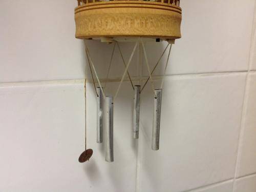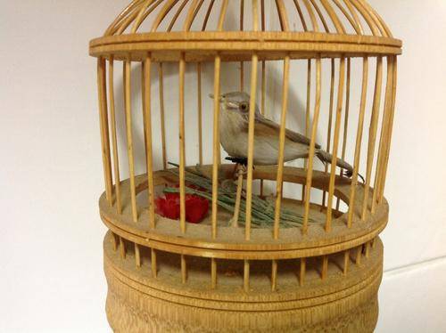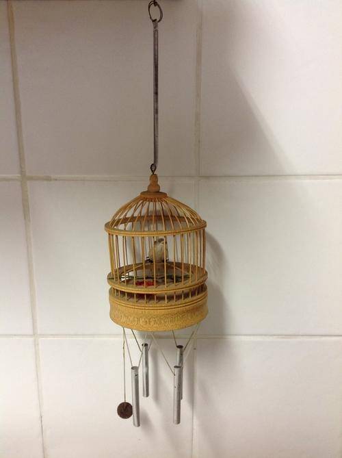 Little Bamboo Bird Cage with Feathered Bird inside and chimes at bottom