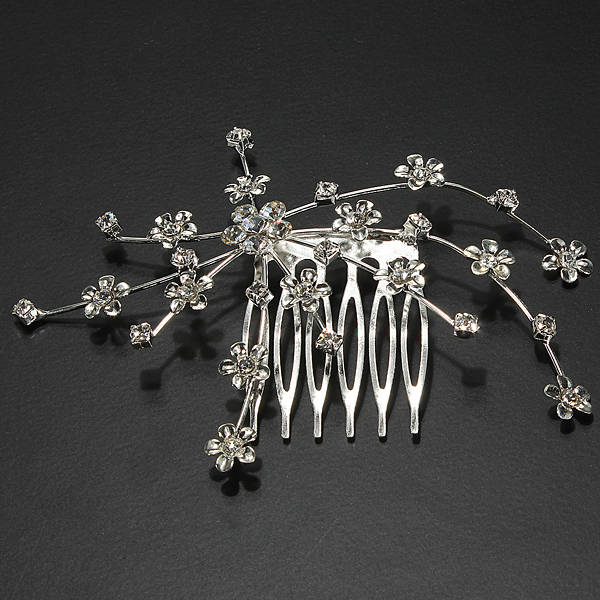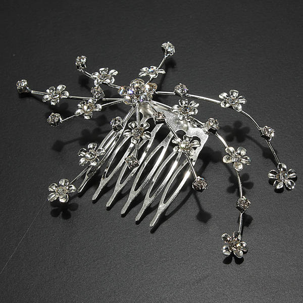 Features: With little spread crystal flower design, this crystal hair comb sure will be glitter and charming for you to use in the wedding, party or prom . Description: Item Type: Crystal Hair Comb Material: Alloy,Rhinestones Length: App 10cm(max) Width: App 7cm(max) Color: Silver Quantity: 1 Pcs Weight: About 11g Package Include: 1 X Crystal Hair Comb Notes: The real color of the item may be slightly different from the pictures shown on website caused by many factors such as brightness of your monitor and light brightness. But we guarantee the style is the same as shown in the pictures.