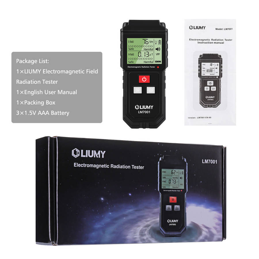 Product Specifications: a Model: LM7001 a Material: ABS Plastic a Color: Black a Range: Electric field: 1-1999V/m; Magnetic field: 0.01T -99.99T a Precision: Electric field: 1 V/m; Magnetic field: 0.01T a Sampling time: About 0.4 seconds (0.4/s) a Reading display: 3-1/2-digit LCD a Alarm threshold value: Electric field: 40V/m; Magnetic field: 0.4T a Testing bandwidth: 5Hz-3500MHz a Test mode: Bimodule synchronous test a Operating Temperature: 0~50a/30a~122a a Operating Humidity: Relative humidity < 80% a Power Supply: 3 * 1.5V AAA Battery (Included) a Item Size: Approx. 135 * 60 * 27mm / 5.31 * 2.36 * 1.06in (L * W * H) a Item Weight: Approx. 107g / 3.78oz a Package Size: Approx. 16.5 * 7.7 * 3cm / 6.50 * 3.03 * 1.18in (L * W * H) a Package Weight: Approx. 147g / 5.18oz