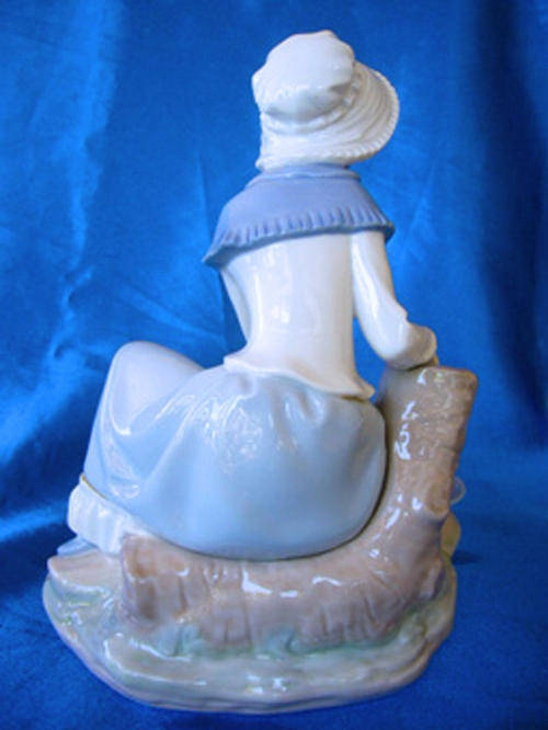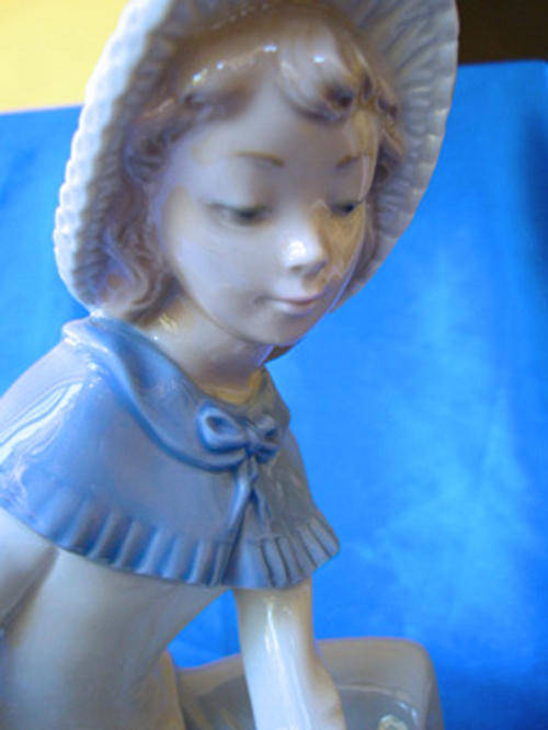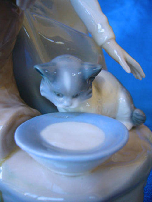 Lladro NAO figure of girl petting her cat as it drinks from a bowl of milk, we believe entitled "Milk for the Cat" (1980).