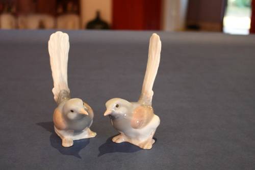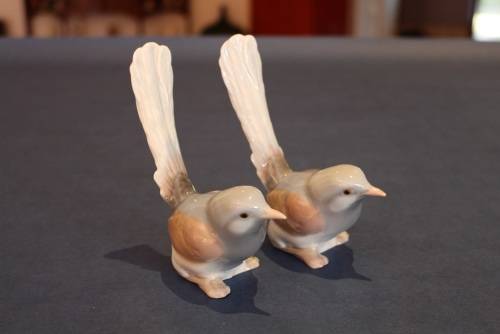 A PAIR OF LLADRO WAGTAILS BY ANTONIO RUIZ FIRST ISSUED IN 1970 AND RETIRED IN 1985. 13cm TALL AND IN MINT CONDITION.