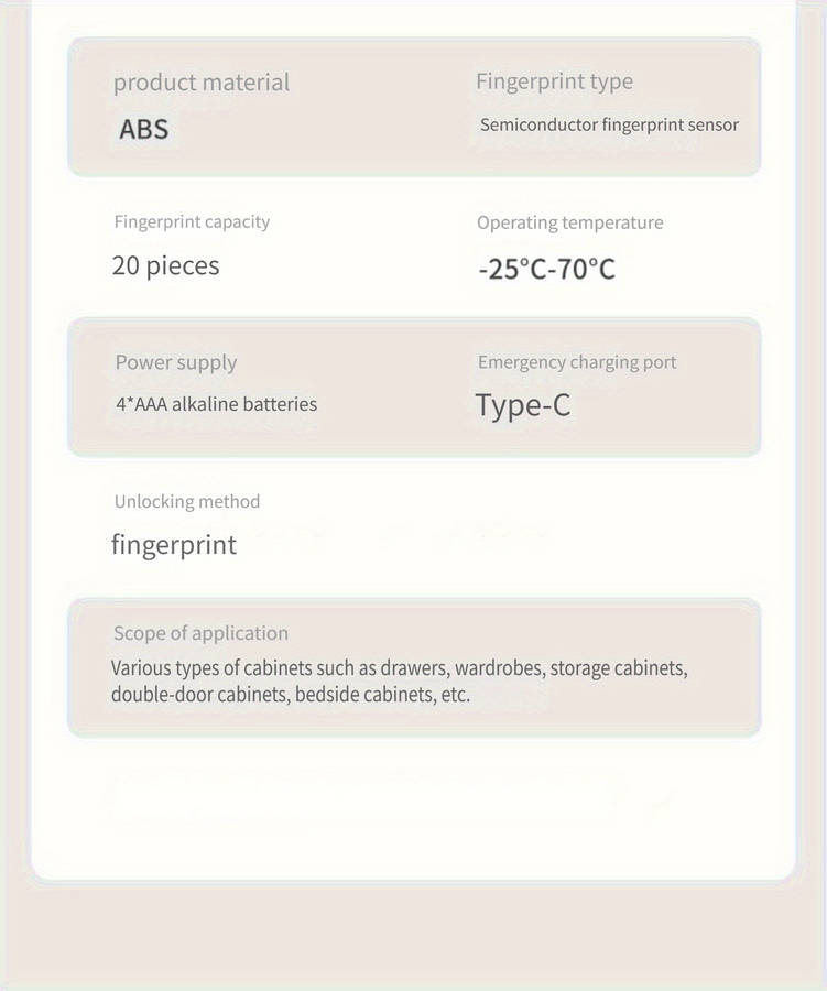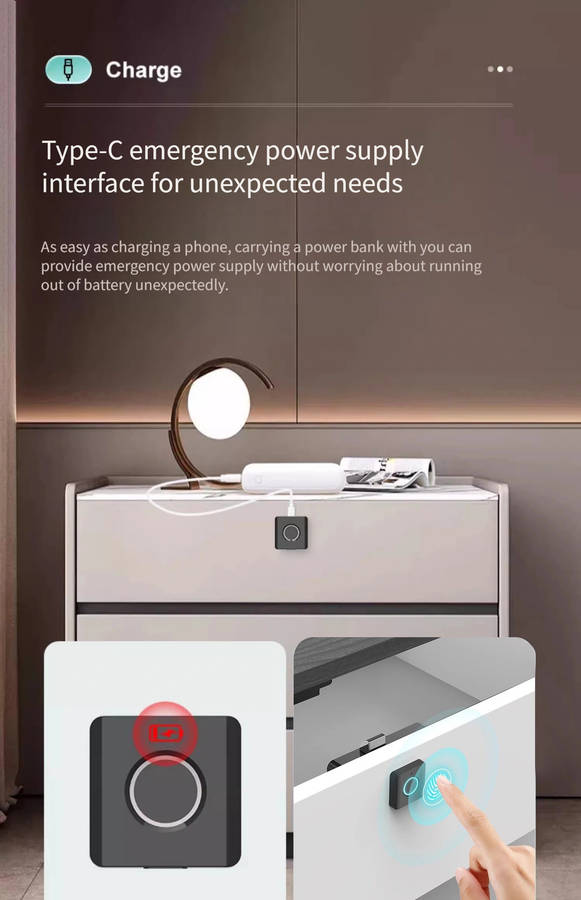 Purchase Instructions: 1. This product is designed for installation on wooden cabinets with a 16mm/0.63in keyhole; drilling may be required if the cabinet door does not have one. 2. Ensure compatibility between the product dimensions and your setup before installation. 3. Batteries are not included; provide 3 AAA alkaline batteries for operation. 1. Upon receiving the lock, any fingerprint can unlock it as there is no registered fingerprint initiallyᄀᆰthis is not a defect. 2. The red light will flash to alert you when battery power is low after unlocking; replace the AAA alkaline batteries promptly. 3. The TYPE-C port at the bottom is for emergency power only, not charging