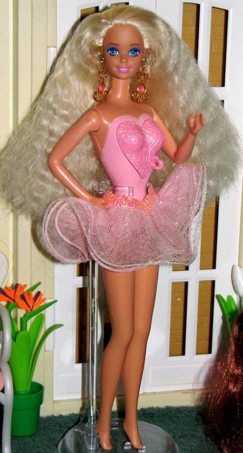 wearing a Barbie skirt & her original earrings, but NO shoes. Has long, wavy