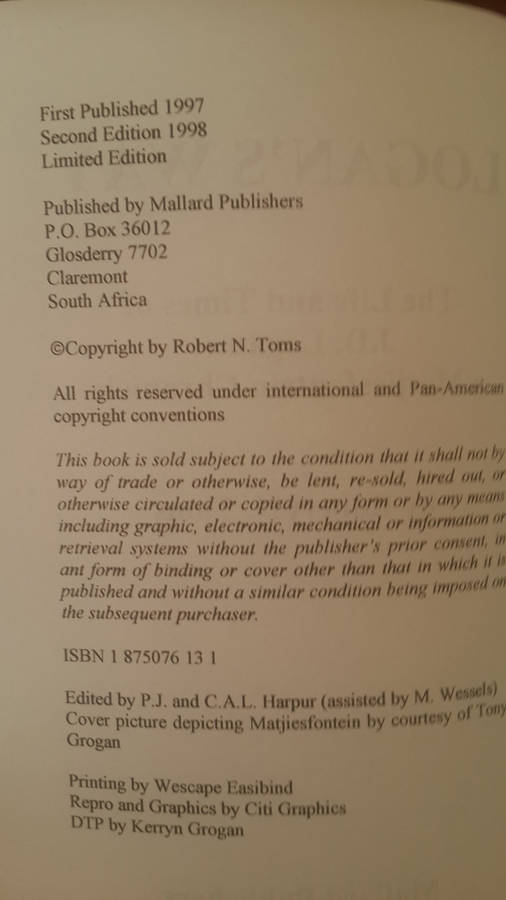 190+ pages with photographs, letters, etc. "In 1884, young immigrant Scot, James Logan, purchased land at "a place called Matjesfontein", an insignificant railway halt in the depths of the Karoo. The Cape Government Railways had, by then, reached the Kimberley diamond fields, and - following Cecil Rhodes' vision of the "road to the North", his dream of a Cape to Cairo line - was extending into the Zambezi hinterland. Logan, whose meteoric rise was based on an energetic and meticulous efficiency, had been awarded the government catering contract at Touws River, which lies within the vast spaces of the Karoo."