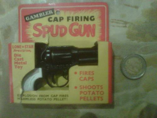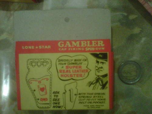 This is a miniature diecast cap gun manufactured by Lonestar England. The gun is in beautiful shape, but the box has two large tears. If you collect vintage toy guns then this little one will be a nice addition to your collection. Item is sold voetstoets.