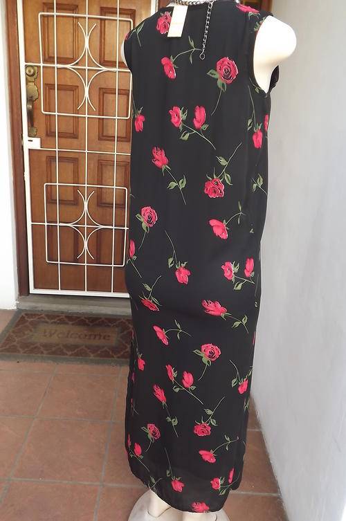 Long Black Lined Polyester Dress with Scattered Red Roses by Elements in size 30/8 according to measurements, for 13-14yr old on label - as new. Dress fully lined with stretch polyester.