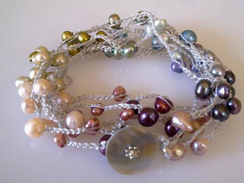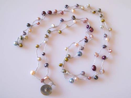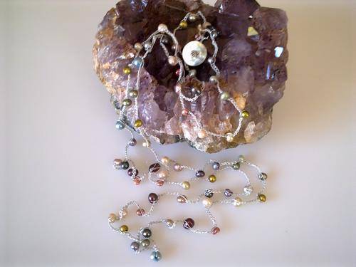 A mix of rainbow hued fresh-water pearls on dove grey silk thread.